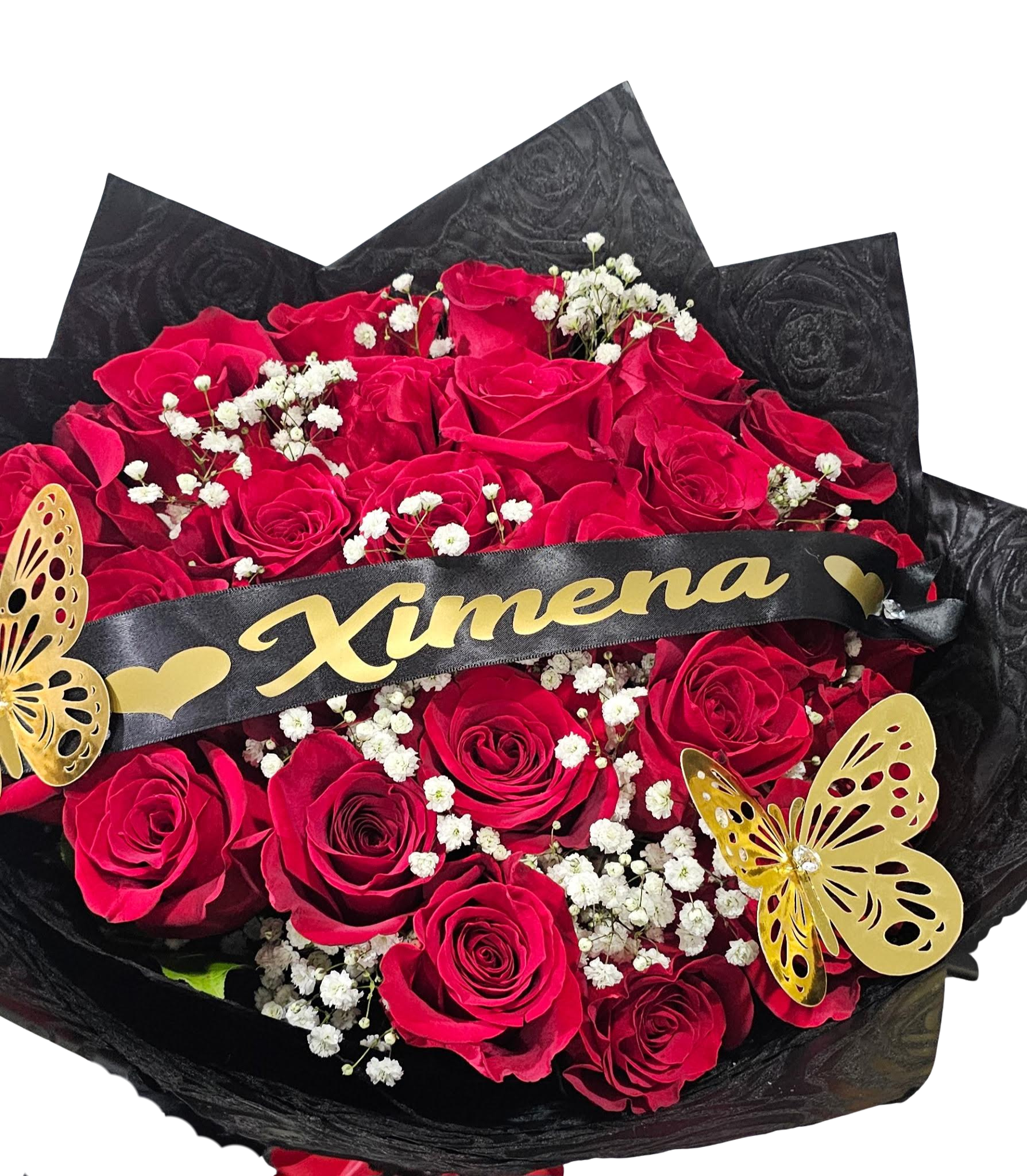 This luxurious bouquet contains 2 dozen fresh roses, personalized banner, butterflies, bow and your choice of paper wrap! Call us today to customize your order.